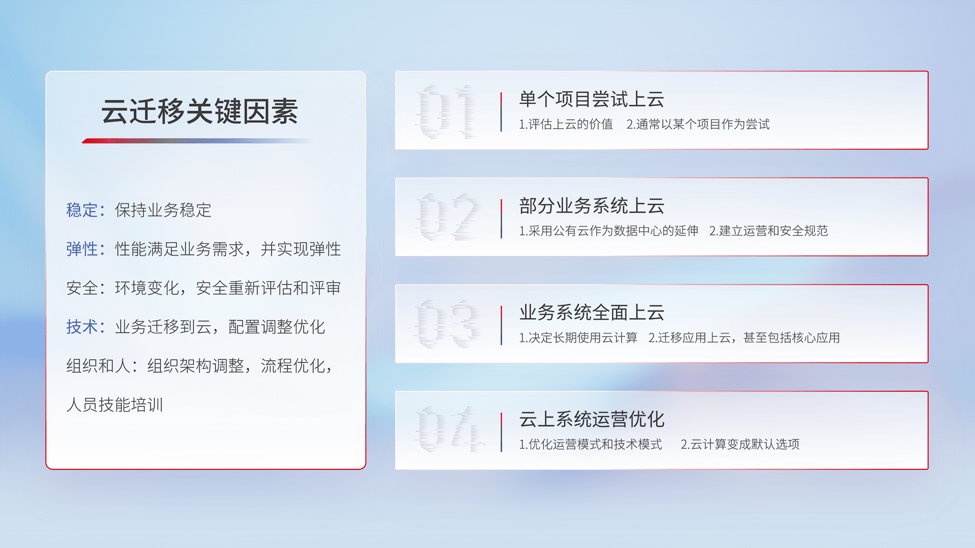 结合实际业务,,,从规划设计、、、、云平台选型、、云原生改造、、、、数据迁移、、、集成交付,,,,迁移全过程为客户识别最佳上云路径,,,,做好风险识别管理,,设计网络架构、、、、身份权限、、安全审计合规、、、操作审计、、日志审计、、、、监控告警策略、、、、多站点容灾设计等,,,对云上基础设施进行整体规划,,,,提升IT治理水平,,,以满足弹性、、、、高可用、、高性能的需求。。